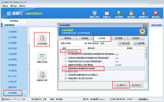 在功能導航窗點“系統(tǒng)管理”—》“系統(tǒng)參數(shù)配置”進入“系統(tǒng)參數(shù)配置”界面,業(yè)務參數(shù)下找到“業(yè)務單據(jù)相關(guān)參數(shù)”,勾選“復制單據(jù)保存單據(jù)編號到引單信息”,設置后點擊“保存”按鈕。
