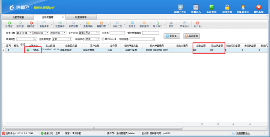 收款金額輸入本次收款金額100元,優(yōu)惠金額輸入20元,然后點擊“自動分配”,可把收款金額和優(yōu)惠金額分配到本次結(jié)銷金額明細中,收款金額+優(yōu)惠金額=本次結(jié)銷金額。分配完成后點擊保存并審核結(jié)算單。則本次收款完成,如下圖所示: