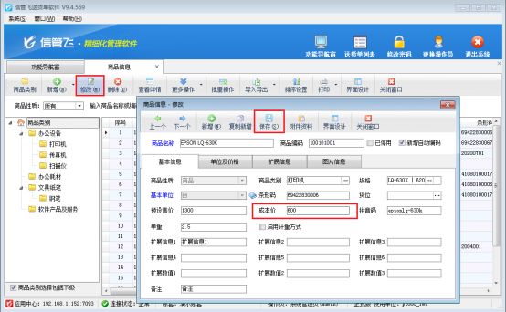 在功能導(dǎo)航窗點(diǎn)擊“基礎(chǔ)資料”—》“商品信息”打開商品信息界面,以商品“EPSON LQ-630K”為例,選擇商品后點(diǎn)擊“修改”按鈕,錄入成本價(jià)為600元,再保存商品信息,如圖所示。