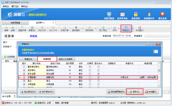 注:新開送貨單頁面默認(rèn)成本單價(jià)及成本金額是不顯示的,可以在“界面設(shè)計(jì)—》“單據(jù)明細(xì)”中把“成本單價(jià)”、“成本金額”打勾顯示出來,方便清晰的看到成本價(jià)及成本金額。