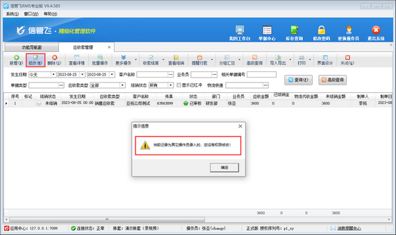 有用戶在修改應(yīng)收款時,會遇到無法修改的情況,系統(tǒng)彈出提示信息“當前記錄為其它操作員錄入的,您沒有權(quán)限修改!”,如下圖所示。