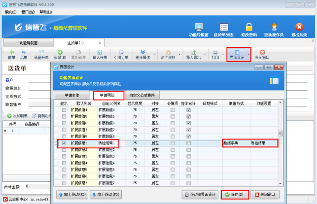 功能導(dǎo)航窗選擇“業(yè)務(wù)處理”,打開新開送貨單界面,點擊工具欄“界面設(shè)計”,界面設(shè)計單據(jù)明細中勾選顯示“擴展信息1”,自定義列名修改為“質(zhì)檢結(jié)果”,取值方式選擇“數(shù)據(jù)字典”,取值設(shè)置選擇質(zhì)檢結(jié)果數(shù)據(jù)項(沒有可先添加再選擇),保存界面設(shè)計。如下圖所示: