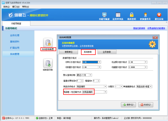 首先設(shè)置商品唯一性匹配方式,在功能導(dǎo)航窗點擊“系統(tǒng)管理”—“系統(tǒng)參數(shù)配置”,選擇系統(tǒng)參數(shù)打開,商品唯一性匹配方式中選擇“商品編碼”,保存參數(shù)配置,如下圖所示: