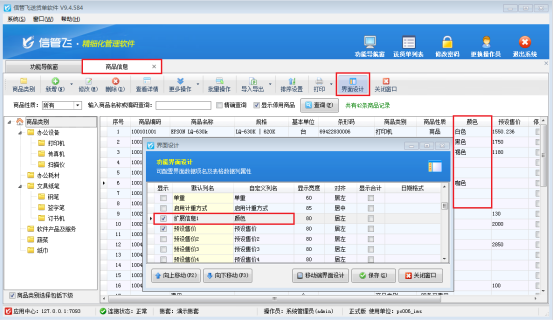 在功能導(dǎo)航窗點擊“業(yè)務(wù)處理”—》“送貨匯總表(按商品)”打開送貨匯總表(按商品)界面,然后在工具欄點擊“界面設(shè)計”,找到“商品擴展信息1”數(shù)據(jù)項,自定義列名修改為“顏色”并勾選顯示出來即可,如下圖所示。