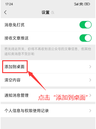 點(diǎn)擊進(jìn)入設(shè)置,在彈出的界面里找到“添加到桌面”選項(xiàng),如下圖:
