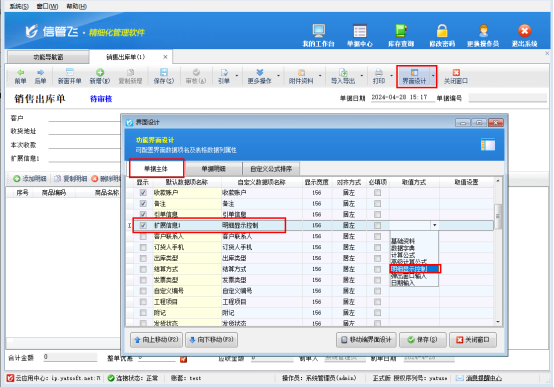 以“銷售出庫單”為例,在銷售出庫單界面,點(diǎn)擊工具欄“界面設(shè)計(jì)”,在單據(jù)主體中,勾選顯示“擴(kuò)展信息1”,向上移動位置,修改自定義列名,取值方式選擇“單據(jù)明細(xì)控制”,如下圖所示: