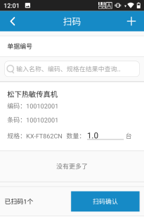 在掃碼界面,點擊Idata設(shè)備掃描按鈕,掃描商品條形碼添加商品明細(xì),可以查看商品名稱和商品數(shù)量,核對無誤后點擊掃碼確認(rèn),如下圖所示:
