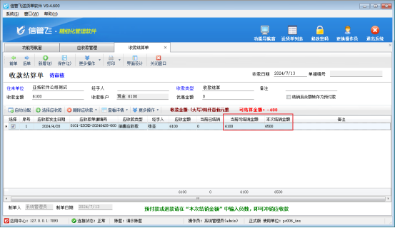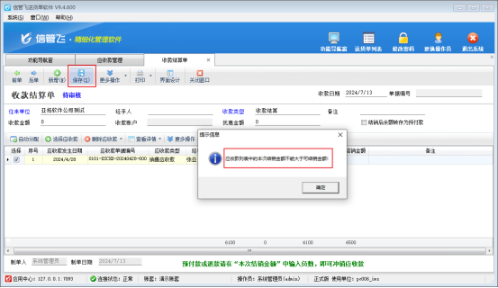 收款結(jié)算單用來登記收款信息(收款對象即客戶、收款賬戶、收款金額、經(jīng)手人等),并結(jié)銷應(yīng)收款記錄。正常情況下,應(yīng)收金額為多少,即客戶支付我們多少貨款,但是部分情況下用戶在開單保存時出現(xiàn)提示信息該如何處理,本篇文章我們介紹下保存結(jié)算單提示“應(yīng)收款列表中的本次結(jié)銷金額不能大于可結(jié)銷金額!”該如何解決?提示信息如下圖所示: