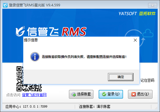 部分信管飛軟件用戶登錄軟件時,提示“連接賬套獲取操作員列表失敗,請重新配置連接并選擇賬套!”,如下圖所示。
