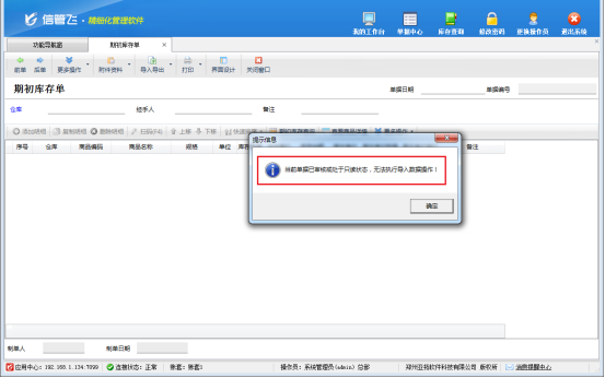 進(jìn)入期初庫存單界面,點擊導(dǎo)入,提示“當(dāng)前單據(jù)已審核或處于只讀狀態(tài),無法執(zhí)行導(dǎo)入數(shù)據(jù)操作!”,如圖:
