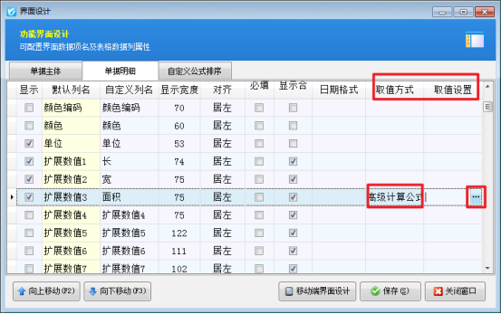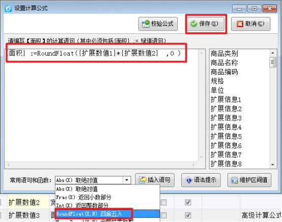 2、選擇“面積”數(shù)據(jù)項(xiàng),設(shè)置取值方式為“高級(jí)計(jì)算公式”,取值設(shè)置為:{面積} :=RoundFloat({擴(kuò)展數(shù)值1}*{擴(kuò)展數(shù)值2} ,0 )。