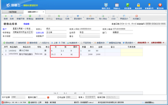 設(shè)置后保存公式,返回開單界面,輸入長(zhǎng)和寬,面積自動(dòng)四舍五入取整顯示。