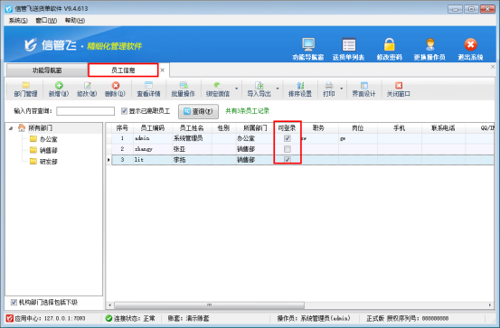 信管飛軟件支持設(shè)置多個可登錄操作員,可不同人員登錄軟件進行操作開單。在員工信息界面,可登錄員工對應(yīng)的可登錄狀態(tài)顯示勾選,如下圖所示: