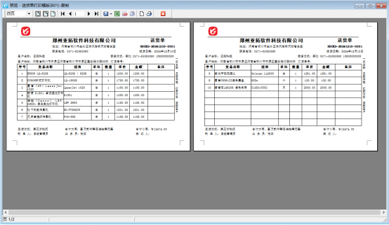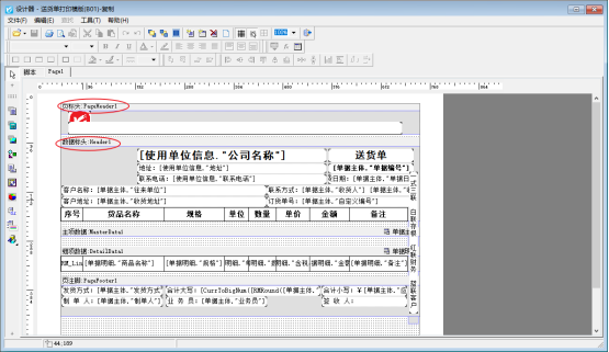 以銷售單為例,打開一張送貨單,點(diǎn)擊打印按鈕下的打印格式設(shè)計(jì)進(jìn)入打印格式設(shè)計(jì)界面,選擇默認(rèn)模板送貨單打印模板(B01)后打開設(shè)計(jì)格式界面,點(diǎn)擊打印預(yù)覽界面可以看到模板的標(biāo)題每頁都顯示的,如下圖所示:
