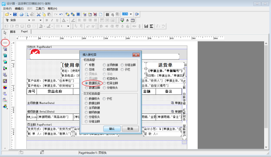 在單據(jù)界面點(diǎn)擊打印---打印格式設(shè)計(jì),選中模板點(diǎn)擊設(shè)計(jì)格式,進(jìn)入模板設(shè)計(jì)器,調(diào)整“頁標(biāo)頭”邊條高度,增加“數(shù)據(jù)標(biāo)頭”邊條,標(biāo)題內(nèi)容移動到“數(shù)據(jù)標(biāo)頭”邊條內(nèi),設(shè)置完成,預(yù)覽查看,如圖所示: