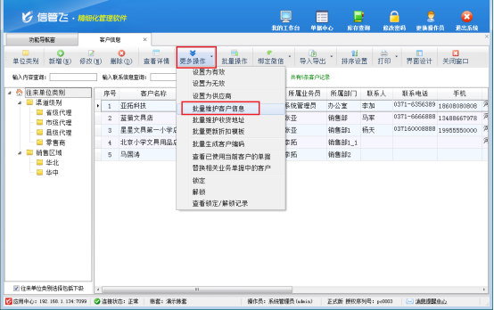 軟件界面設(shè)計簡潔直觀,操作流程清晰易懂。用戶只需在功能導(dǎo)航窗點擊“基礎(chǔ)資料”—“客戶信息”,進(jìn)入客戶信息界面后,通過工具欄的“更多操作”選擇“批量維護(hù)客戶信息”,即可進(jìn)入批量維護(hù)界面。在這里,企業(yè)能夠快速進(jìn)入批量操作模式,輕松勾選需要設(shè)置所屬業(yè)務(wù)員的客戶信息,簡單幾步即可完成批量設(shè)置,讓客戶信息管理變得輕松簡單。