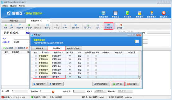 設(shè)置完成后,我們在功能導(dǎo)航窗點擊“銷售管理”——》“銷售出庫單”,打開新增銷售單界面,在“界面設(shè)計”—》“單據(jù)明細”內(nèi)將系統(tǒng)參數(shù)配置中配置的參數(shù)值“擴展信息30”自定義列名修改為“客戶型號”,然后將此數(shù)據(jù)項配置顯示出來,如下圖所示。