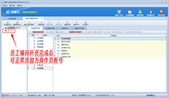 有使用信管飛軟件的用戶,在設(shè)置操作員賬號(hào)時(shí),添加操作員賬號(hào)不成功,如下圖所示。 演示視頻觀看鏈接:信管飛軟件操作員賬號(hào)添加不成功,如何解決演示視頻 出現(xiàn)以上問(wèn)題的原因是:被添加為操作員賬號(hào)的員工信息沒(méi)有員工編碼導(dǎo)致(一般通過(guò)導(dǎo)入表格生成的員工信息可能不存在員工編碼,如導(dǎo)入日記賬表格時(shí),直接