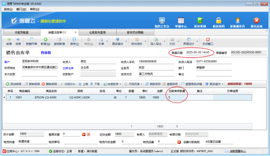 用戶在使用進銷存軟件過程中,遇到在銷售出庫單界面點擊刷新庫存按鈕,當前庫存數量未更新為該商品的當前實際庫存數量,是什么原因呢,該如何解決?     例如商品名稱“EPSON LQ-630K”,倉庫庫存數量是5個,出庫單開單界面點擊刷新庫存當前庫存數量是0,經檢查發現原因是該商品入庫單發生時間是5月30日14點