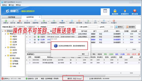 在商貿流通領域,送貨單作為貨物交接的核心憑證,其簽收與回執流程直接影響企業資金流轉效率與風險管控能力。信管飛送貨單軟件以智能化流程管理為核心,通過“待簽回-已簽回-已結賬”三階狀態控制,實現貨物交付全鏈路可視化追蹤,更以精細化權限管理功能,為企業筑牢運營安全防線。    針對多角色協作場景,信管飛送貨單軟件創新推出操作權限分級機制