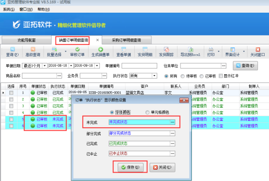 為了更清晰的顯示訂單的執行狀態和滿足客戶的自定義需求,亞拓管理軟件的訂單執行狀態的顏色可自由設定顏色顯示。 以亞拓管理軟件為例,設置訂單的執行狀態顏色(系統默認未完成黑色、部分完成藍色、已完成綠色、已中止褐紅色)。打開銷售管理—》右側的相關統計查詢下的銷售訂單明細查詢—》界面設計下拉框—》訂單“執行狀