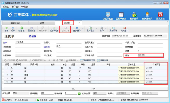紅管家送貨單軟件、亞拓管理軟件都支持先開(kāi)訂單,然后送貨單和采購(gòu)銷(xiāo)售出庫(kù)單可以引用訂單的內(nèi)容。有時(shí)候需要引用訂單的附記內(nèi)容,可以在送貨單等單據(jù)引用訂單的時(shí)候可在送貨單界面的單據(jù)明細(xì)顯示引單附記內(nèi)容。 以送貨單軟件為例,如何引用訂單顯示引單附記?軟件默認(rèn)引單附記調(diào)用的是訂單的備注內(nèi)容。先開(kāi)一個(gè)訂單,訂單的