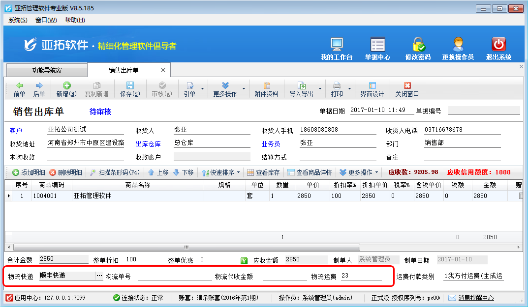 亞拓管理軟件標(biāo)準(zhǔn)版及專(zhuān)業(yè)版內(nèi)都可以設(shè)置提取物流快遞數(shù)值(如運(yùn)費(fèi))至單據(jù)指定的數(shù)據(jù)項(xiàng)內(nèi),本篇文章以亞拓管理軟件專(zhuān)業(yè)版為例介紹一下如何提取物流快遞運(yùn)費(fèi)至單據(jù)指定數(shù)據(jù)項(xiàng)內(nèi)?一、維護(hù)物流快遞運(yùn)費(fèi) 在功能導(dǎo)航窗點(diǎn)擊“基礎(chǔ)資料”—》“物流快遞”打開(kāi)物流快遞信息界面,修改“順豐快遞”運(yùn)費(fèi)為23元(可將物流快遞運(yùn)費(fèi)維護(hù)在“擴(kuò)展數(shù)值(數(shù)據(jù)項(xiàng)英