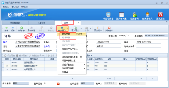 信管飛送貨單軟件、信管飛RMS軟件等支持開銷售單之前先開訂單。銷售單可以引用訂單進(jìn)行開單。對(duì)于剛下訂單出錯(cuò)或者取消訂單的,軟件支持刪除訂單操作。以信管飛送貨單軟件為例,示范下如何刪除已審核的訂單單據(jù)? 訂單保存后可以在訂單列表中進(jìn)行查看,對(duì)于未審核未執(zhí)行的訂單,可以直接在訂單列表工具欄刪除按鈕進(jìn)行刪除