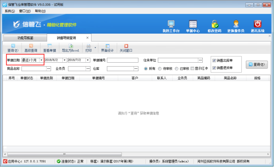 信管飛倉庫管理軟件、信管飛RMS軟件等軟件內(nèi)都包含統(tǒng)計(jì)查詢功能(采購單列表、銷售單列表、采購單明細(xì)查詢、銷售單明細(xì)查詢等統(tǒng)計(jì)查詢報(bào)表),軟件內(nèi)統(tǒng)計(jì)查詢報(bào)表默認(rèn)查詢?nèi)掌谑恰白罱?天”如下圖1所示,如需要修改默認(rèn)查詢?nèi)掌,該如何修改呢?下邊以“信管飛倉庫軟件軟件”為例示范如何修改默認(rèn)查詢?nèi)掌凇?nbsp;圖1 銷售明細(xì)查詢界面 &