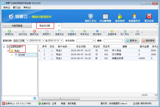 很多剛學(xué)出納的學(xué)員都需要找一些出納電腦記賬表格、出納記賬表、出納記賬表格模板、出納Excel流水賬表格等出納相關(guān)記賬表格,以方便按照表格模塊進行記賬。信管飛出納記賬軟件中包含豐富的記賬統(tǒng)計表格,比如日記賬表格、現(xiàn)金銀行賬簿、資金日(月)報表等等,可以通過軟件中的導(dǎo)出為Excel功能,生成記賬表格或者直接在出納軟件中把記賬記錄打印出表格下面就給大家介