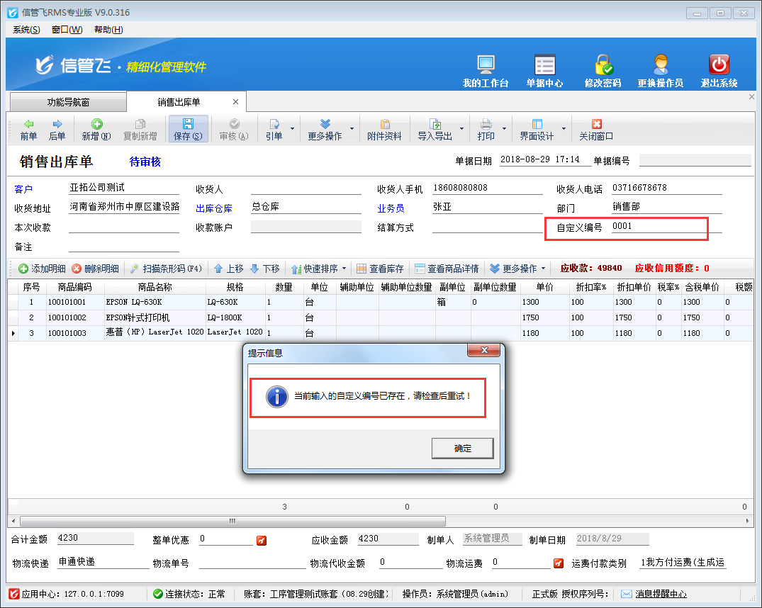 亞拓軟件自主研發的信管飛RMS、信管飛送貨單軟件、信管飛倉庫管理軟件等都支持開單后自動生成單據編號,另外,軟件也支持錄入自定義編號(不是單據編號),用戶可以在自定義編號內錄入訂單合同號等信息,為了避免錄入的自定義編號出現重復,軟件支持參數設置自定義編號不可重復。 以信管飛RMS為例,在“系統管理”—》“系統參數配置”—》“業